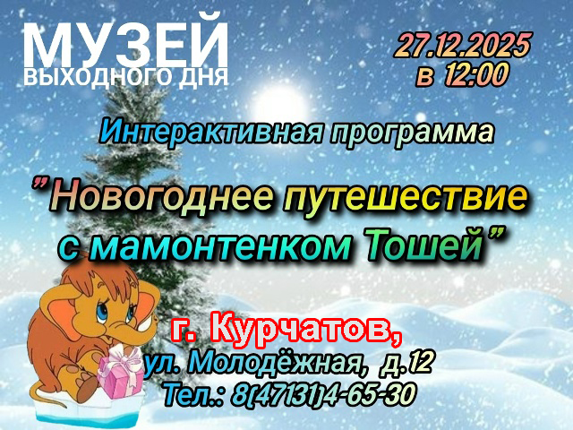 В субботу, 27 декабря, Курчатовский краеведческий музей (филиал Курского областного краеведческого музея) приглашает совершить путешествие с мамонтенком Тошей.