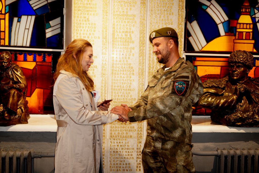 28 сентября в Курском областном краеведческом музее Антон Карпов, военный корреспондент, писатель, командир поискового отряда «Архангела Михаила» ДОСААФ РФ, заместил командира поискового отряда «Ахмат» ДОСААФ РФ, передал Орден Красной Звезды семье награждённого.
