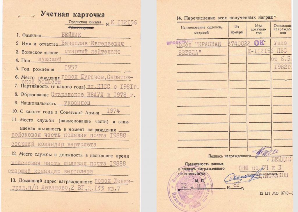 Старший командир вертолёта, старший лейтенант Бейдик Вячеслав Евгеньевич выполнял интернациональный долг в Афганистане. В 1982 году был награждён Орденом Красной Звезды. Награда была утеряна. И вот, наградной знак вернулся в семью.