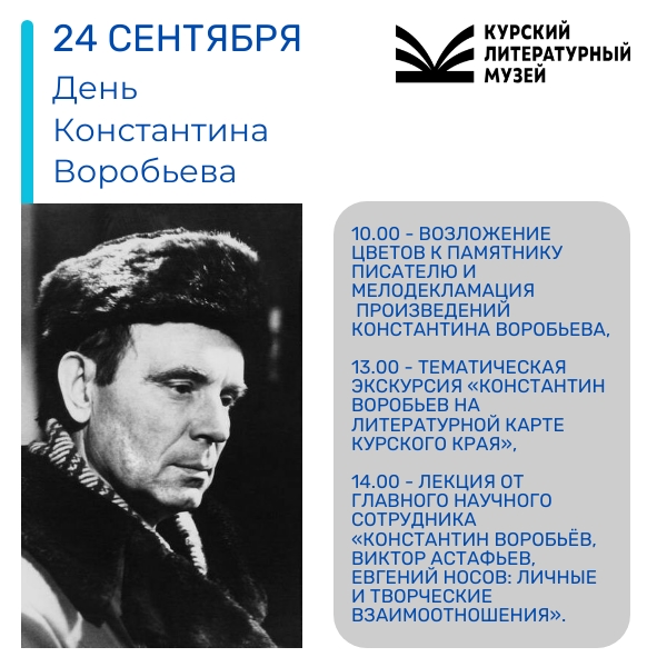 24 сентября, в день рождения Константина Воробьева, Литературный музей (филиал Курского областного краеведческого музея) приглашает любителей хорошей литературы принять участие в памятных мероприятиях, посвящённых писателю Константину Воробьеву!