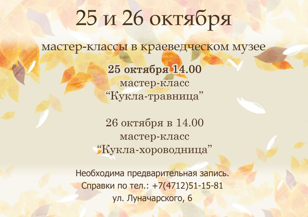 25 октября в 14:00 приглашаем Вас посетить мастер-класс “Кукла-травница”, а 26 октября так же в 14:00 — мастер-класс “Кукла-хороводница”.