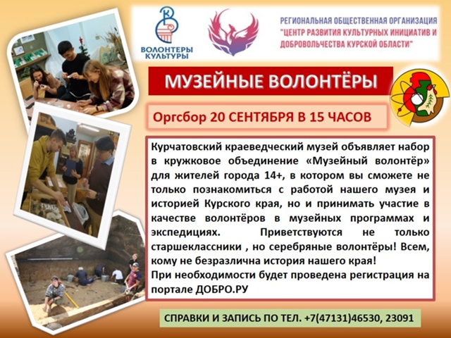 Курчатовский краеведческий музей приглашает интересующихся историей родного края в возрасте 14+ в кружок «Музейный волонтёр» на бесплатной основе.