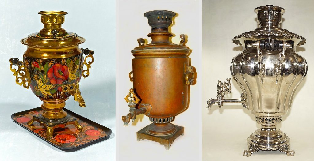 Самовары были разные, маленькие и большие, толстенькие и низенькие, круглые или ящичком, овоидные или грушевидные, с различными формами резервуаров для воды, на гнутых тоненьких ножках, сверкающие железными, бронзовыми, латунными боками.