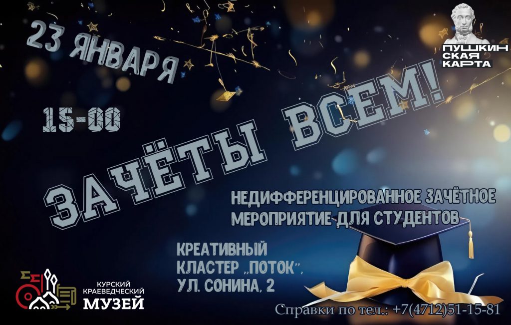 23 января в 15-00 приглашаем самых лучших, креативных и зажигательных студентов на театрализованный концерт «Зачеты всем!», посвященный Татьянину дню. Вас ждут согревающие музыкальные номера от колледжа им. Г.В. Свиридова и фронтмена группы «ДИНОЗАВРЫ ВЫМЕРЛИ!» Ивана Левшина, неординарные ведущие, море эмоций и поток позитива, свежий микс из музейной педантичности, юной энергии и торжествующего искусства.