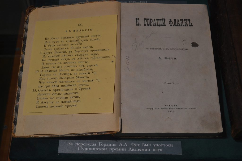 В экспозиции Курского областного краеведческого музея находятся книги Иоганна Гёте 1889 года и Квинта Горация 1883 года издания в переводах Афанасия Фета.